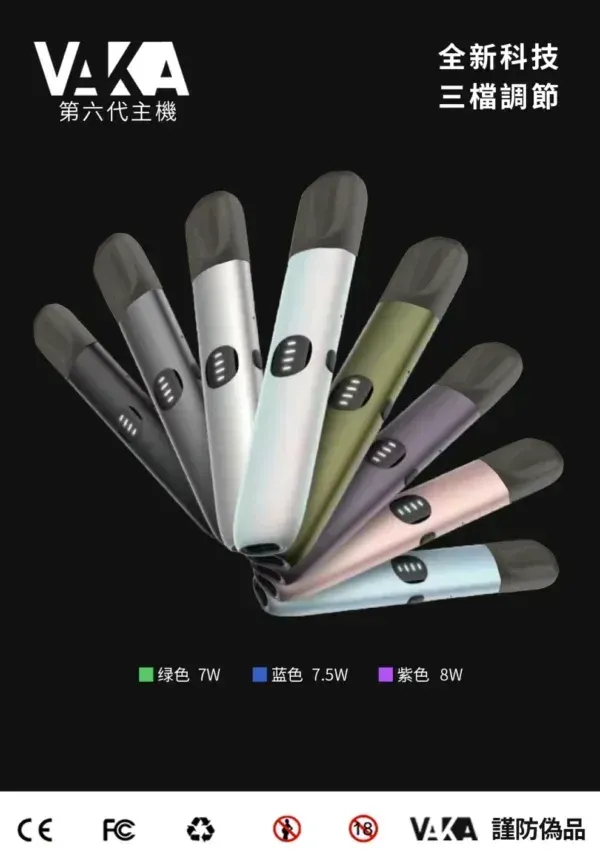 VAKA五代主機的出現,為台灣電子煙市場帶來一陣革新風潮。它不僅擁有跨品牌兼容性,打破了傳統電子煙主機的品牌限制,更以高品質的材料和設計,為使用者提供極致的吸煙體驗。產品描述 VAKA電子煙主機 – 五六代通用,三段功率調節,極致吸煙體驗 VAKA主機(VAKA電子煙主機)是為電子煙愛好者精心打造的高端設備,結合創新技術與現代設計,帶來卓越的使用體驗。內建三段功率調節(7W/7.5W/8W),可自由選擇溫和至濃郁的煙霧強度,滿足不同需求。 三段功率調節 綠色檔位: 7W,適合溫和體驗。 藍色檔位: 7.5W,煙霧適中,口感平衡。 紫色檔位: 8W,煙霧濃郁,適合重度玩家。 高兼容性設計 VAKA五代電子煙主機兼容多款煙彈,包括: Relx四代無限煙彈 Relx五代幻影煙彈 市面上通用的五、六代煙彈 無論您偏愛哪種煙彈,VAKA主機都能完美適配,讓吸煙更隨心所欲。 時尚輕便設計 這款電子煙主機外觀時尚,輕便易攜,並提供多種顏色選擇,為您的電子煙體驗增添個性化風格。 立即體驗VAKA主機 VAKA六代電子煙主機專為成年用戶(18歲以上)設計,提供更高效、更流暢的煙霧體驗。立即入手,享受科技與品味兼具的吸煙樂趣!